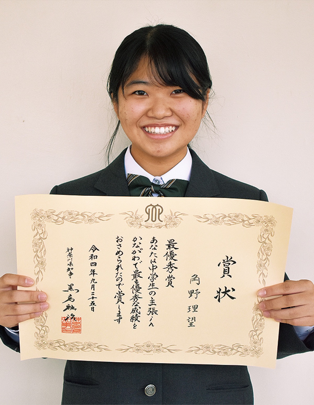 日々の生活で考えていることなどを作文で発表する「中学生の主張inかながわ」が9月25日、県立青少年センター(横浜市)で開かれ、春日野中学校3年生の角野理望(すみのさとみ)さんが最優秀賞にあたる県知事賞を受賞した。