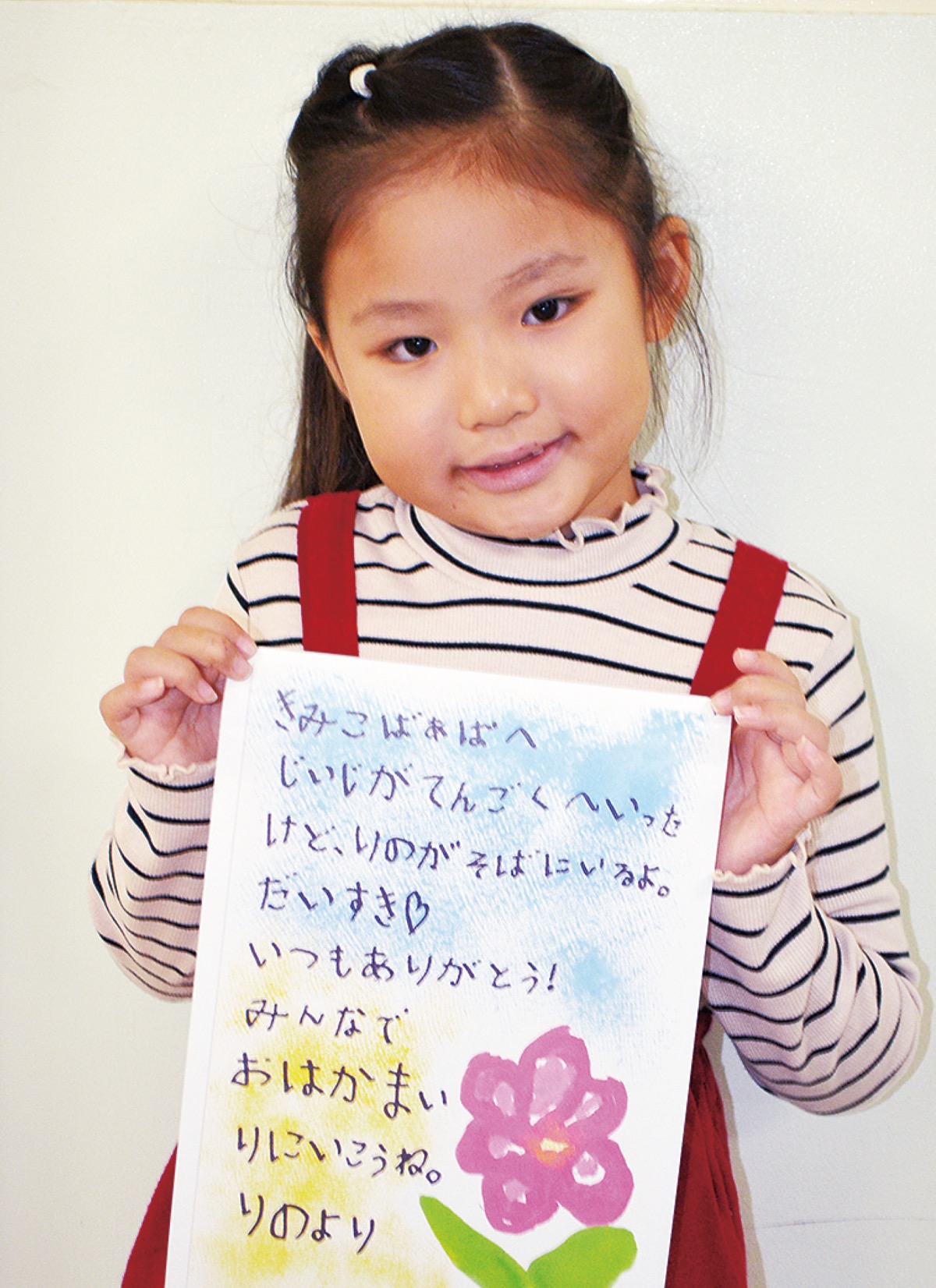 絵の具を使ってはがきいっぱいに背景の空や花を描き、「じいじがてんごくへいったけど、りのがそばにいるよ」と、祖母に寄り添う気持ちを優しい言葉でしたためた。はがきを受け取った祖母からは「気持ちが届いたよ。ありがとう」のメッセージとともに、祖父の写真の横に置かれたはがきの写真が送られてきたという。