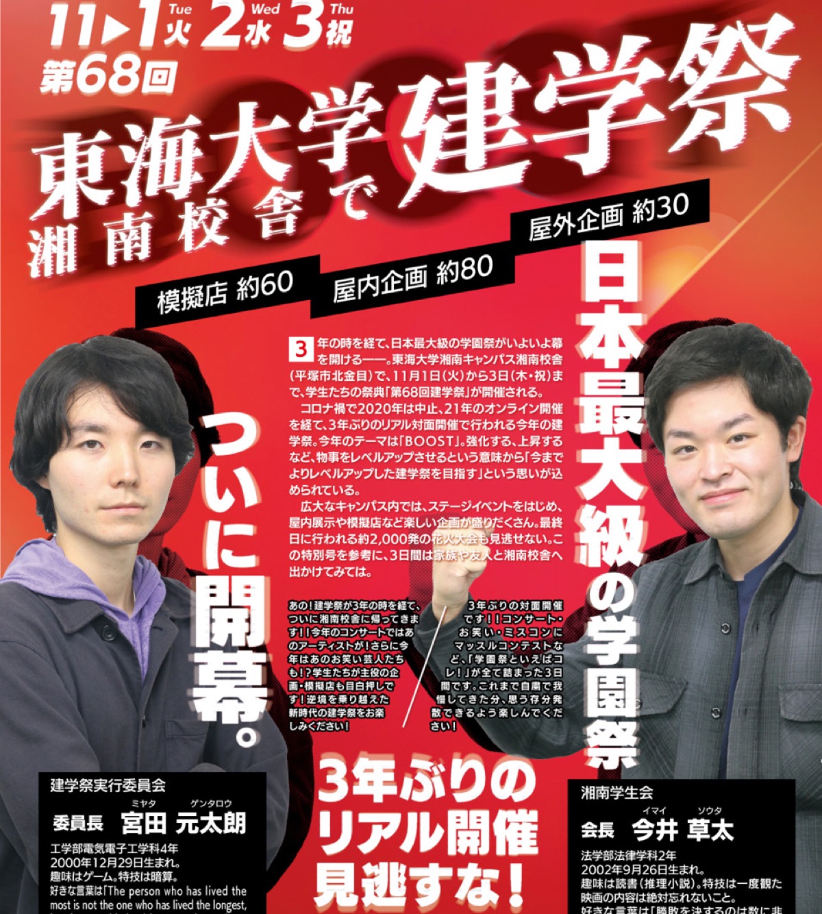 3年の時を経て、日本最大級の学園祭がいよいよ幕を開ける――。東海大学湘南キャンパス湘南校舎(平塚市北金目)で、11月1日(火)から3日(木・祝)まで、学生たちの祭典「第68回建学祭」が開催される。