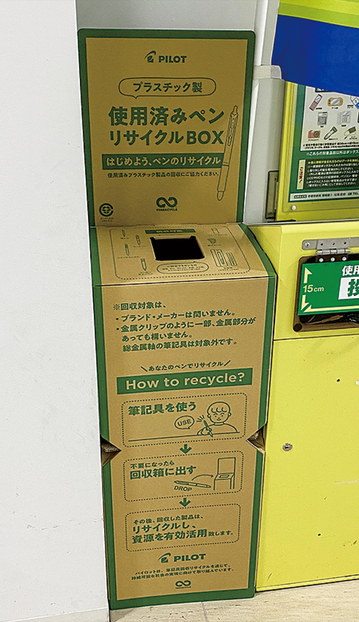 回収箱は、市役所本館1階北東出入口の階段付近に設置されている。プラスチック製のボールペンやシャープペンシル、マーカー、修正テープ、包装材などが対象で、同社以外の製品や一部に金属が付属しているものでも構わないという。