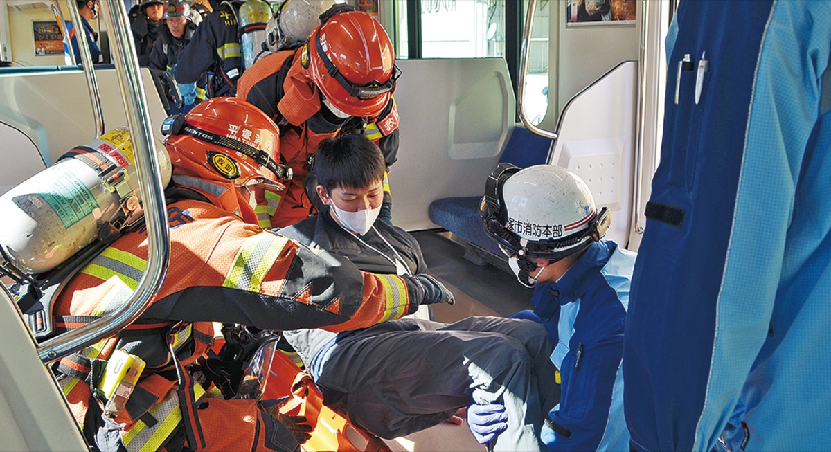訓練には、平塚盲学校の全盲の教諭2人も参加。要救助者として足場の悪い線路上を、消防隊員に支えられながら歩いて避難した。消防隊員は目の見えない人への救助時の配慮などを学んだ。
