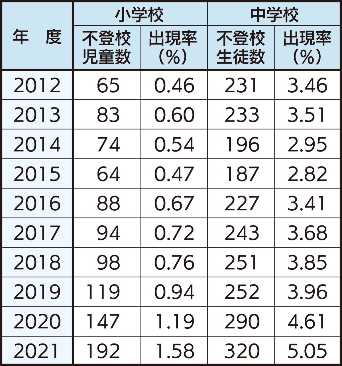 小学校の不登校出現率は1・58%で、県全体(1・42%)と全国(1・3%)を上回り、中学校では初めて5%を超えた。不登校のほか、病気や新型コロナウイルスの感染回避などを含めて長期欠席した児童生徒数は、小学校で367人、中学校で476人だった。