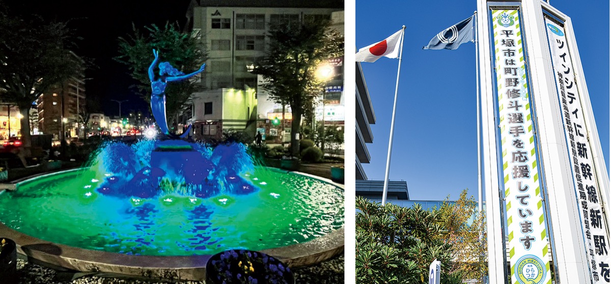 平塚市役所は、本館東南入り口前に「平塚市はW杯サッカー日本代表町野修斗選手を応援しています」と書かれた懸垂幕を12月19日(月)まで掲出。平塚駅南口広場の噴水は日没から10時までベルマーレカラーにライトアップされている。18日(日)まで。いずれも日本代表の活動日程によって変更する場合あり。