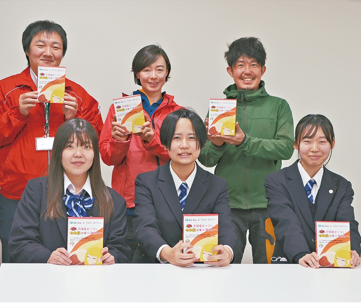同校からは地域課題解決の研究等を行うマーケティング部の中釜羽七さん(商業科3年)、府川昌友美さん(同)、農業クラブ食料生産班の鶴岡伊織さん(農業科2年)が参加。パッケージをデザインした中釜さんは、暖色のグラデーションと白い部分でカレーライスを表現し、頬張る女性のイラストも考案。「絵でカレーを表現するのが難しかった。いい経験になった」と完成品に笑顔を見せた。