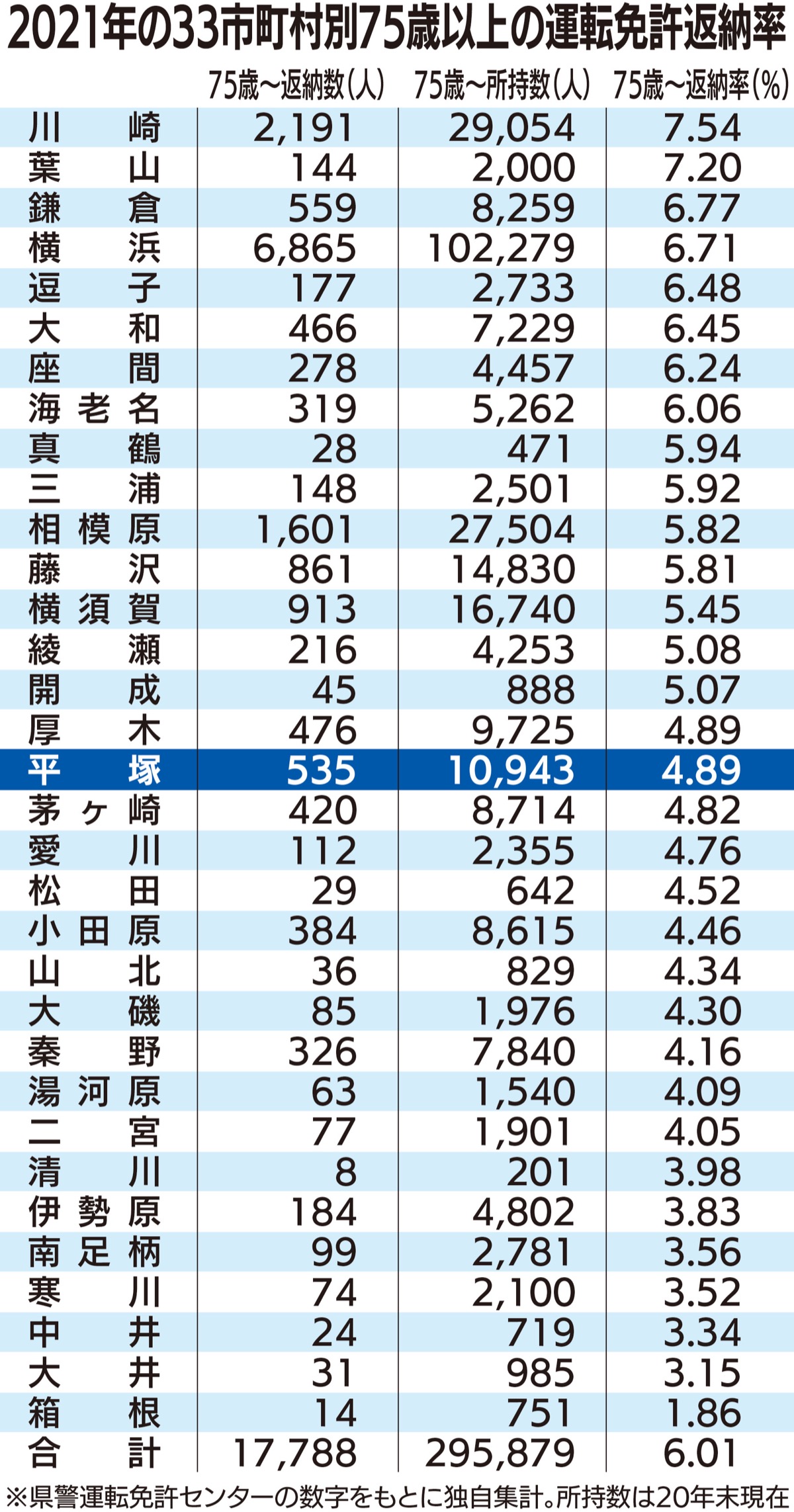 75歳以上の後期高齢者ドライバーについて、タウンニュース社ではこのほど、免許証の返納率を神奈川県警の統計を基に独自調査した。2021年に県内で自主返納したのは、所有者の6・01%にあたる1万7788人。最も高いのは川崎市中原区(9・16%)、最も低いのは箱根町(1・86%)で、地域間で最大4・9倍の開きがあることがわかった。平塚市は県内33市町村で17位の4・89%だった。