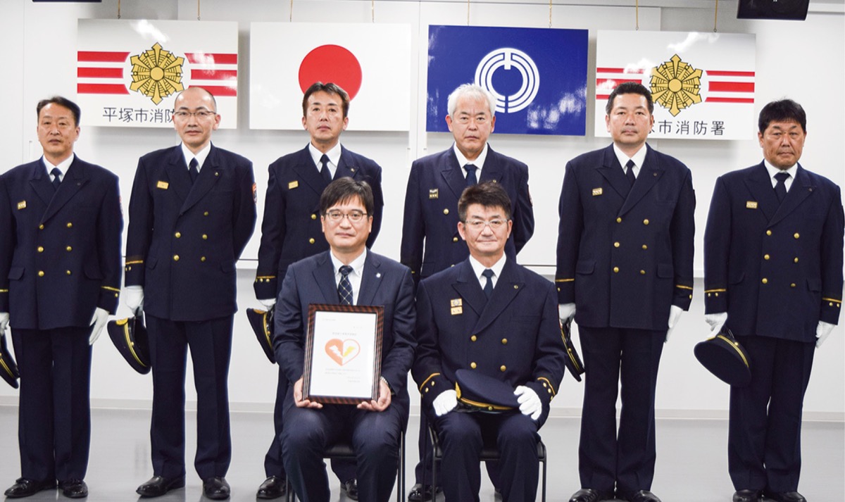 市消防本部は1月18日、西八幡で高砂香料製品を集約し出荷業務を担っている高栄産業株式会社(佐藤聖彰代表取締役社長)に平塚市救急協力事業所の登録証を交付した。自動体外式除細動器(AED)の設置など、市民の救命率向上に寄与する企業に認められるもので、市内の登録数は20事業所。