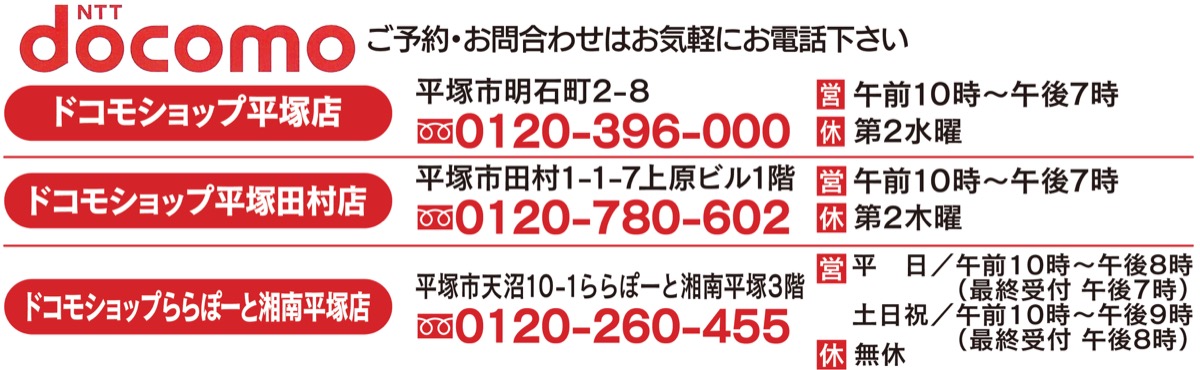 ドコモショップ平塚店・平塚田村店・ららぽーと湘南平塚店