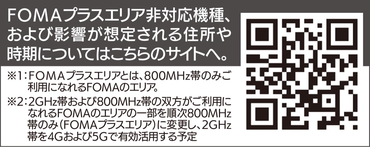 この設備集約の影響により、「FOMAプラスエリア(※1)非対応」の機種を利用中のユーザーは、2022年1月から一部のエリア(※2)で通話・通信が利用ができない状況となっている。