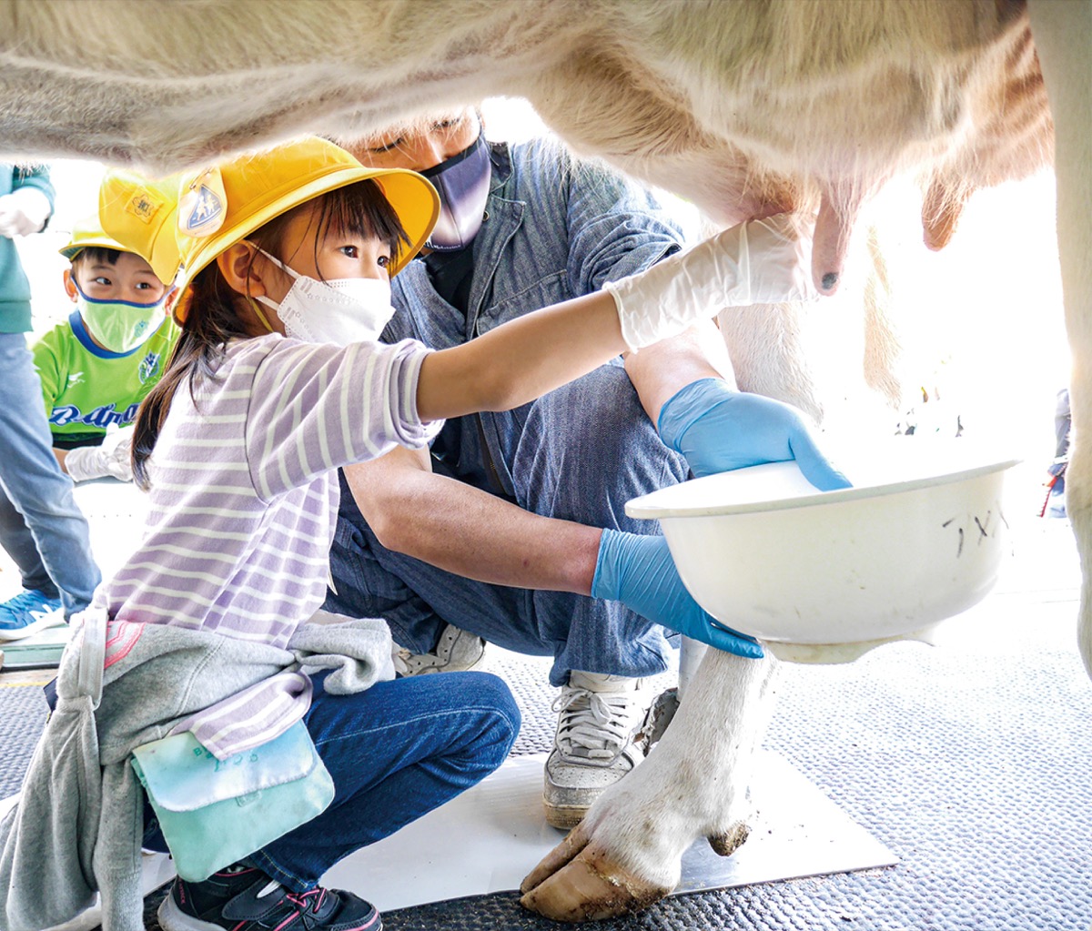 市内の若手酪農家たちが結成した「角笛会」が3月16日、吉沢小学校で搾乳体験事業を開催した。子どもたちに地元で搾った生乳を飲んでもらおうと、約10年前から市内の小学校や幼稚園などで行っている。