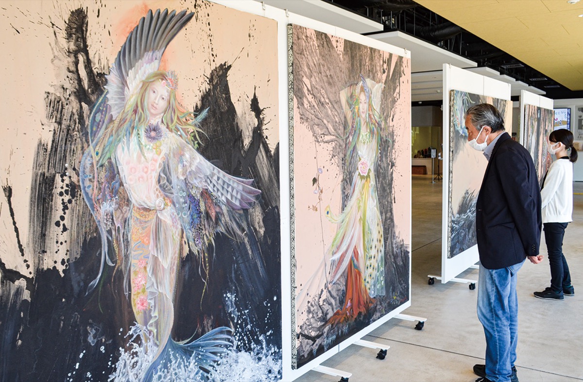 川口さんは「自然の生命体の強さを描いた。エネルギーに満ちた生命体を探し、目に見えない向こう側の世界を表現したい。絵を身近に感じてもらいたいので、公園帰りに寄ってくれたらうれしい」と呼びかけた。