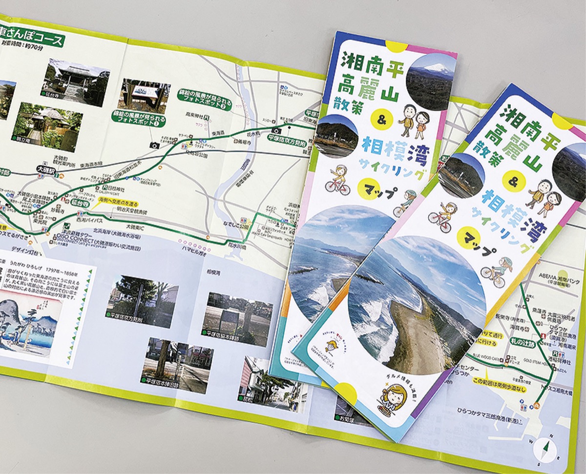 平塚市と大磯町が共同発行する湘南平高麗山ガイドマップ第2弾「湘南平高麗山散策&相模湾サイクリングマップ」が完成し、市内各所で配布されている。
