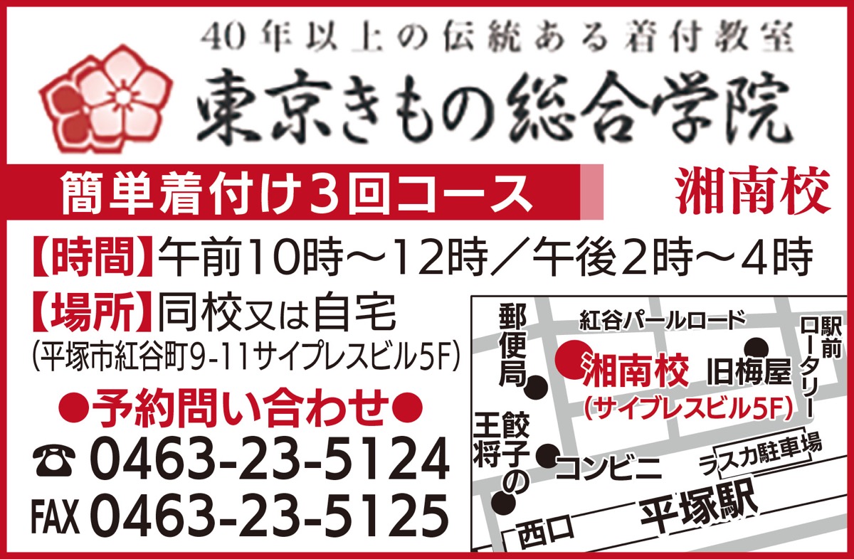 “キレイに、楽に、楽しく”をモットーに平塚で40年以上続く着付け教室「東京きもの総合学院湘南校」で4月6日(木)〜5月10日(木)、「簡単着付け3回コース(無料)」が実施される。