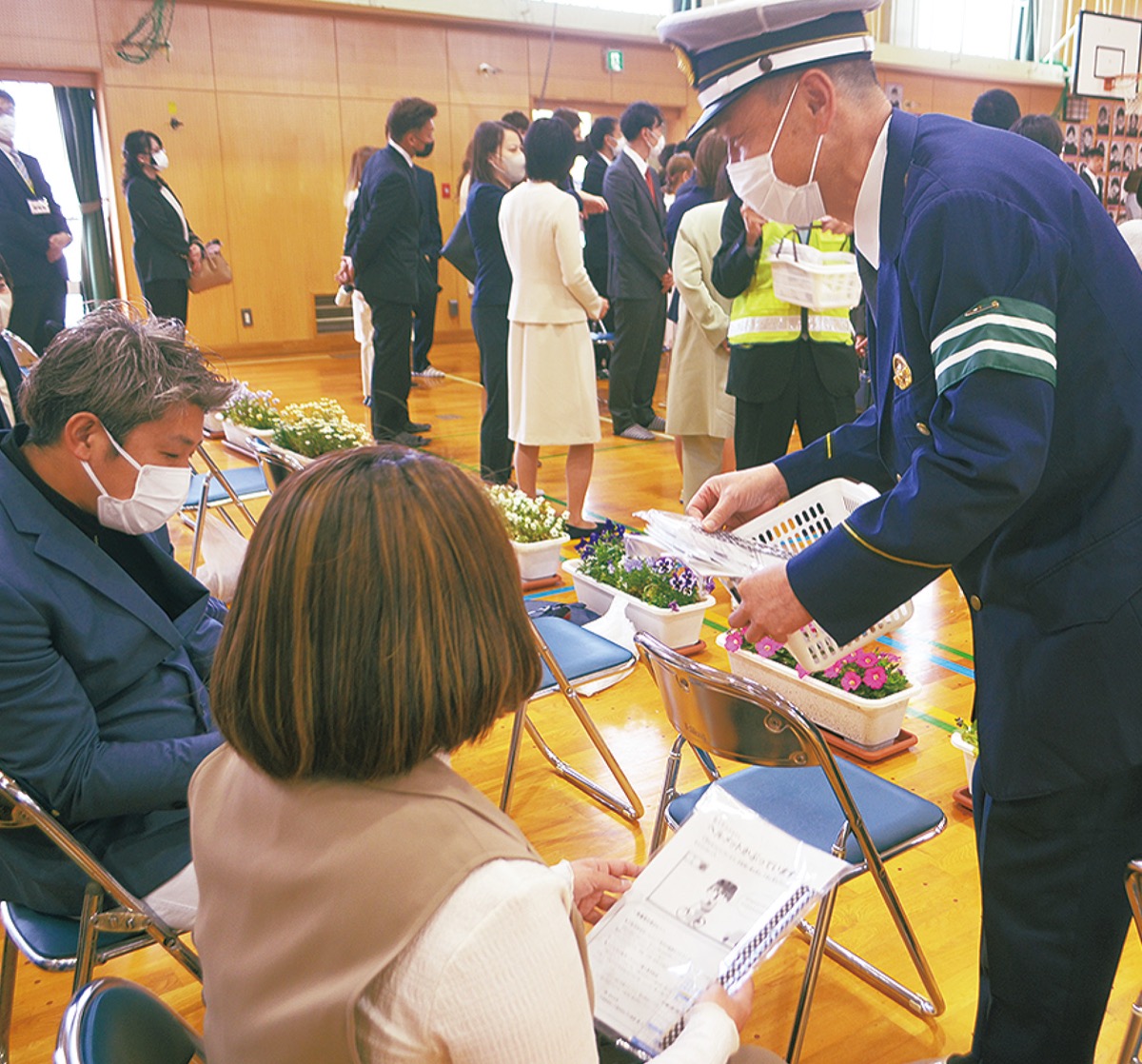 平塚市立神田小学校(山田美保校長)の体育館で4月6日、新入学児童を交通事故から守ろうキャンペーンが行われ、入学式に参列した保護者約120人に、啓発グッズが配布された。=写真