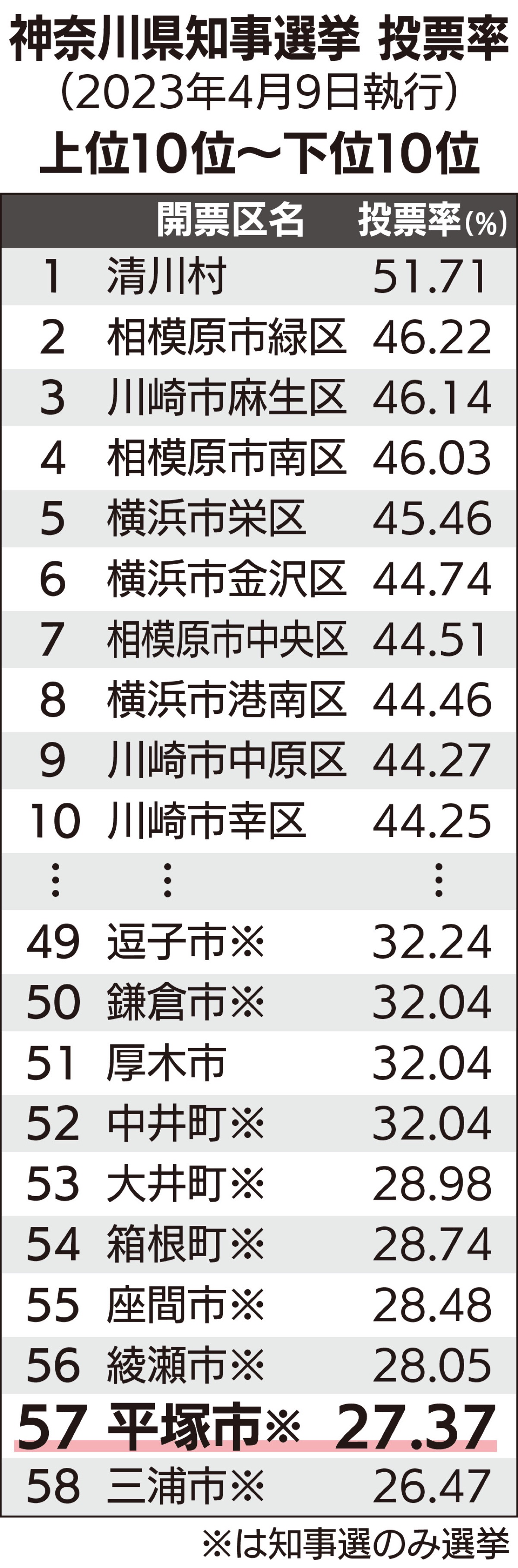 ・50%。一方、平塚市など県議選が無投票で知事選のみだったエリアは軒並み投票率が低い。ワースト10位のうち9エリアが県議選無投票だった。