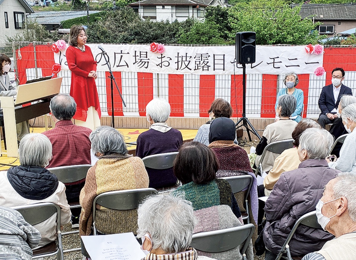 社会福祉法人つちや社会福祉会が、市内土屋で運営する高齢者施設の隣接地に交流広場を整備し、創立49周年にあたる4月25日にお披露目された。セレモニーには声楽家の岩崎由紀子さんが招かれ、澄んだ歌声を利用者らに届けた。
