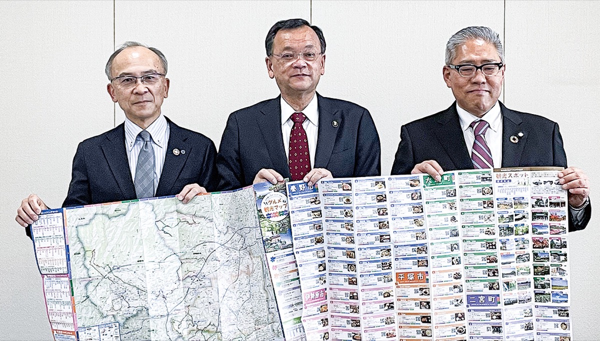 中南信用金庫(大磯町・大藤勉理事長)と中栄信用金庫(秦野市・北村圭一理事長)が業務提携30周年を記念して「旧中郡の古のつながりを紡ぐグルメ観光マップ」を制作し、5千部を市に寄贈した。4月28日に行われた贈呈式で両理事長から落合克宏市長にマップが手渡された。