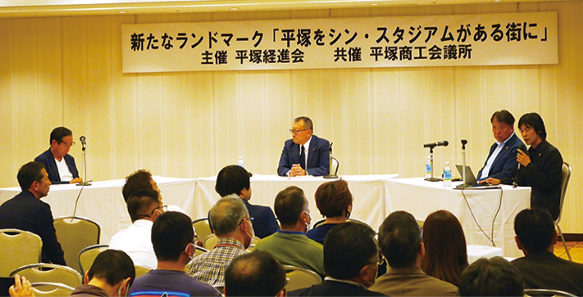 「新たなランドマーク『平塚をシン・スタジアムがある街に』」と題した講演会が、5月17日に平塚プレジールで開かれた。湘南ベルマーレの眞壁潔会長や、新スタジアム建設を進めている川崎フロンターレから事業本部地域連携リーダーの岩永修幸さんらを招き、平塚経進会が主催した。