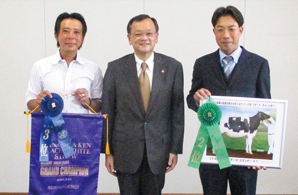乳牛の改良成果を競う「ブラックアンドホワイトショウ」が4月14日と15日に静岡県御殿場市で開催され、平塚市から伊藤宏さんと片倉幸一さんが入賞した。2人は5月18日に落合克宏市長を訪問し、受賞を報告した。