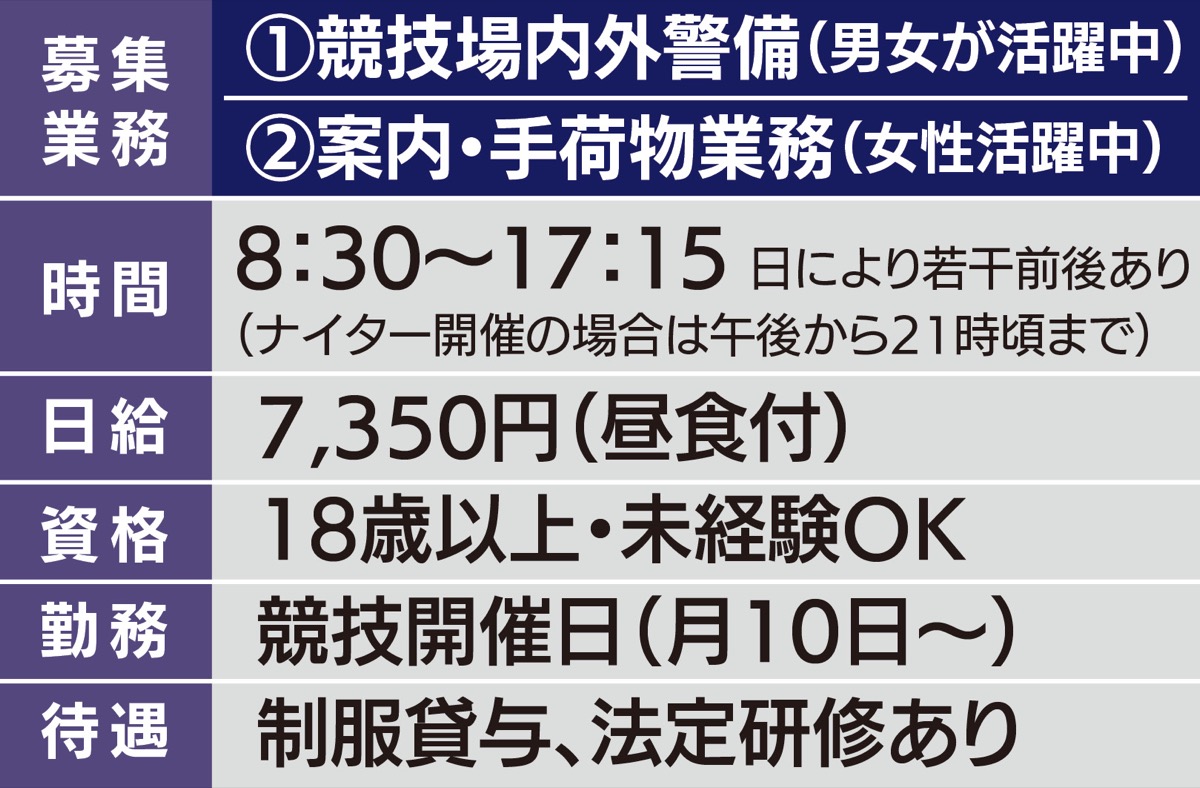 担当するのは新日本警備保障(株)=本社・横浜市西区。募集するのは競技場内外の警備と会場案内の業務。いずれも男性、女性を問わず活躍しており、特に女性は40代、50代の人が多数活躍しているという。月10日からの勤務で休憩時間もたっぷり。昼食付でダブルワークもできる。