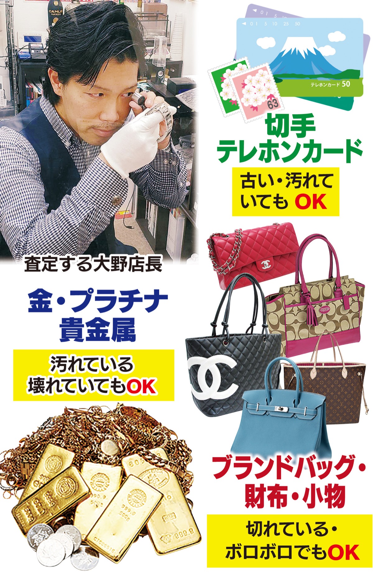 同店では、金・プラチナなどの貴金属はもちろん、ヴィトンやエルメス、シャネルなどのブランドバッグをはじめ、切手やテレカ、金券、洋酒など多種多品目を取り扱っている。大野店長は「初めての方でも安心してご利用ください。誠意ある接客を心がけます」と爽やかな笑顔で呼びかける。
