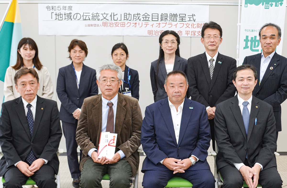 同社平塚支社の山本恵支社長は「豊かな文化活動の継承に役立てていただければ」と話し、同保存会の相原会長は「老朽化した舞台設備の新調に充てさせていただく。後世にしっかりと文化を引き継いでいきたい」と感謝を述べた。