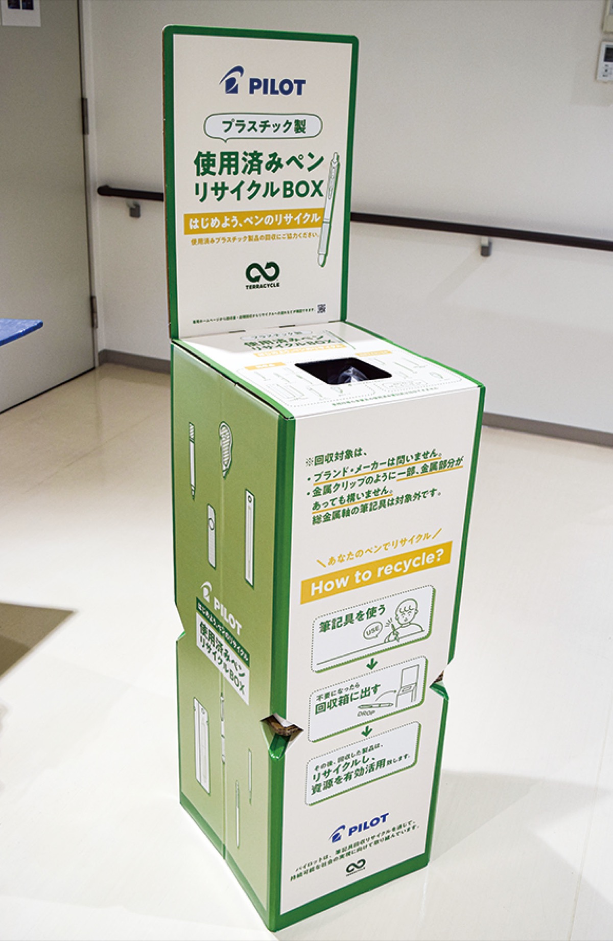 同社は2020年から社内で使用済みのペンを回収してリサイクルする活動を続けている。平塚市内に工場を構えている縁で、昨年10月には平塚市と連携して同様のプログラムを開始。市役所本館に回収ボックスを設置した。