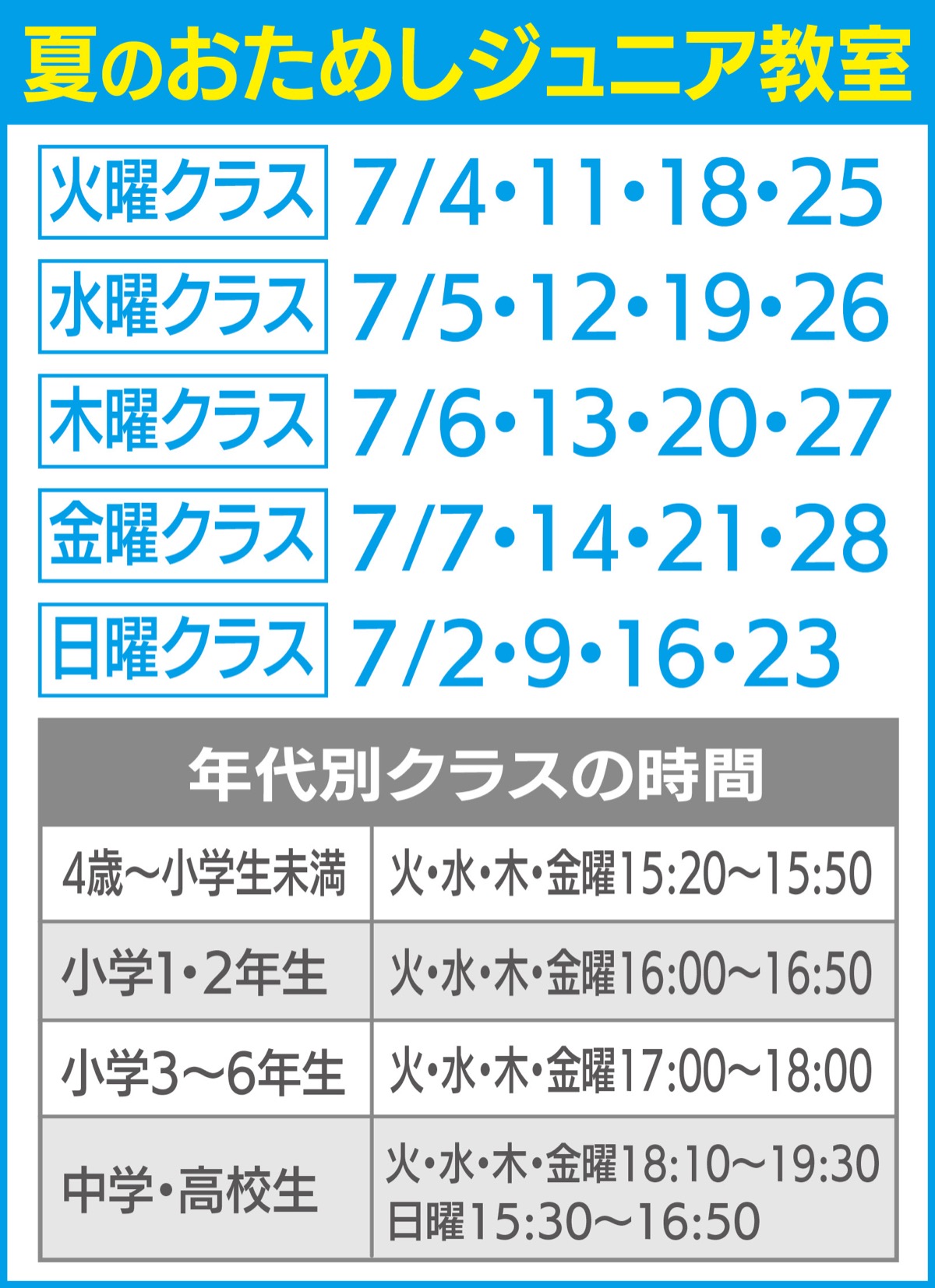 夏の朝得・夜得キャンペーンを7月31日まで実施中。期間中に午前・ナイターの一般クラス入会で、半年間(7月〜12月)の毎月の受講料が15%オフに(通常9900円→8415円)。