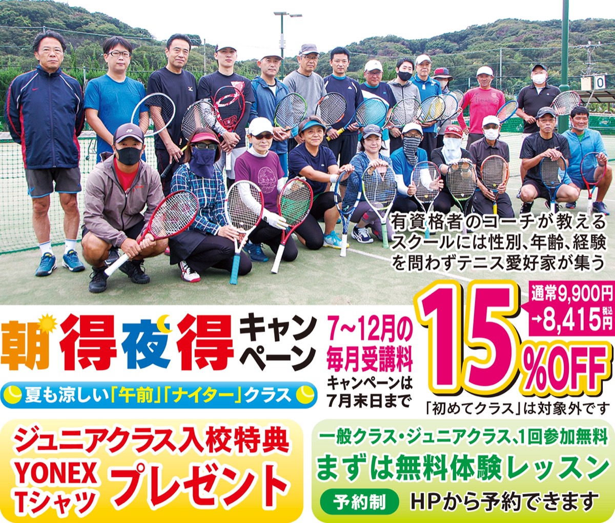 リゾート感たっぷりのコートで快適にプレイが楽しめる湘南平テニスクラブ。同クラブでは夏のスクールの生徒募集を開始した。新設の「初めてクラス」は、まったくの初心者、運動が苦手という人のためのクラスで月謝もリーズナブル(月4回=1回45分・4950円)。気軽にテニスを始めるチャンスだ。