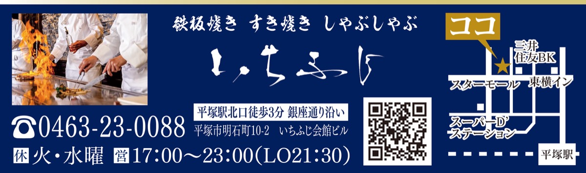 平塚の風物詩・七夕祭りも開催間近。和洋折衷の鉄板焼き・すき焼き・しゃぶしゃぶが楽しめる、「いちふじ」がこの春、駅北口から徒歩3分のスターモール商店街に自社3階建ビルでオープンした。個室6室、宴会など32席以上ある大広間も完備しているから幹事さんは必見だ。