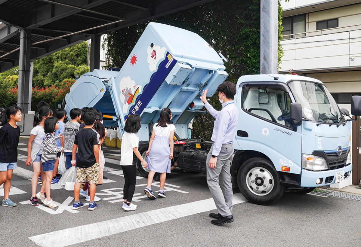 ごみ収集車にごみを投げ込む体験をした児童は、「楽しかった。実際に見ることができて分かりやすい」と話した。自分たちが普段集積所に捨てるごみがどのように集められているかを知る機会にもなった。