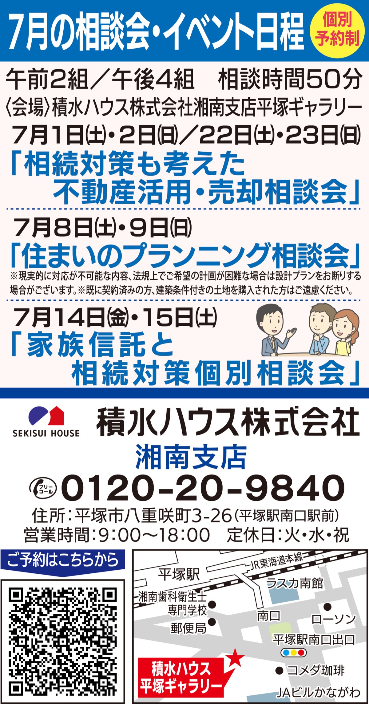 7月14日(金)・15日(土)は、「家族信託と相続対策個別相談会」を実施。「認知症になった親の不動産は売れるのか」や「家族信託と後見人制度の違いについて」など、専門家が解説する。