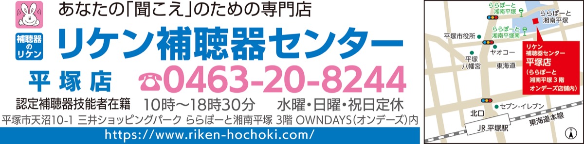 三井ショッピングパーク ららぽーと湘南平塚 3階OWNDAYS(オンデーズ)内にオープンしたばかりの『リケン補聴器センター平塚店』で補聴器の2週間無料貸し出しを実施中。「フォナック」「オーティコン」「スターキー」などの補聴器の装用体験ができる。最新のものから話題の充電式補聴器まで、様々な試聴が可能。「最適な補聴器を選ぶことができます」と同店。
