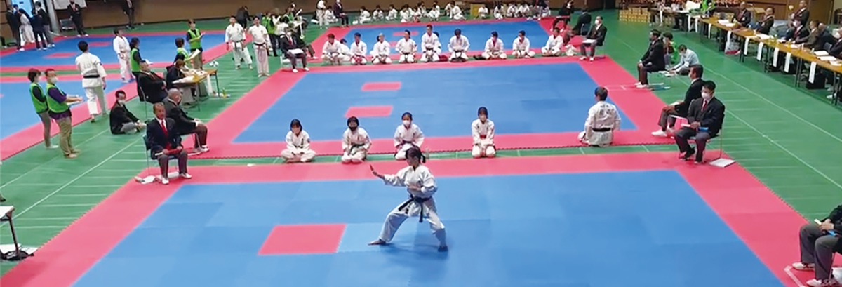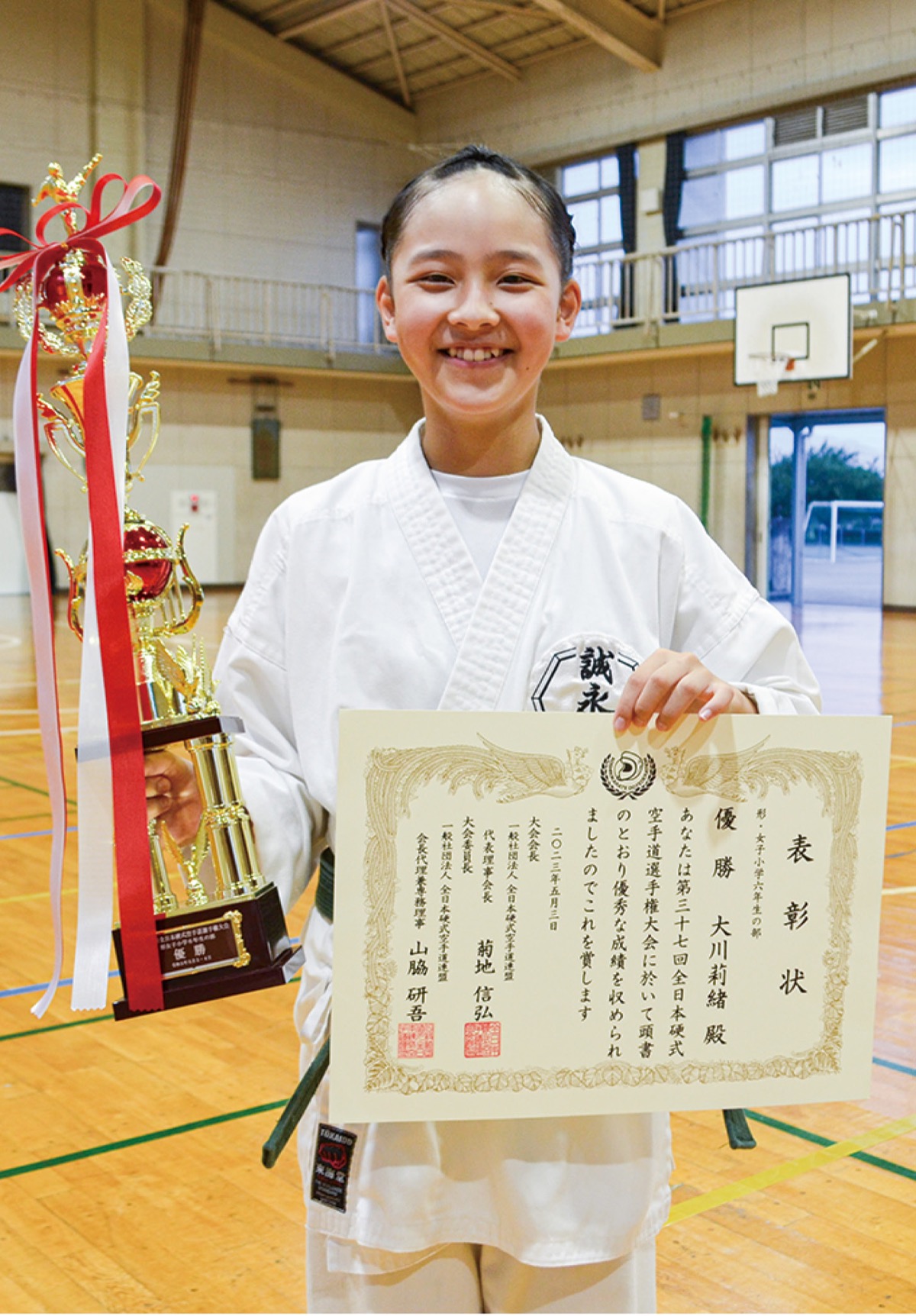 女子小学6年生の部には地区予選を勝ち抜いた7人が出場。大川さんは初戦で帯色も上、体格も大きく上回る相手に、大きな声と切れのある演武で快勝する。決勝では流派を代表する形「観空大」を披露。ダイナミックな演武で審査員を魅了し、勝利をつかんだ。大川さんは「とてもうれしい。指導してくれた八田館長や周囲の人々に感謝したい」と喜びを溢れさせた。