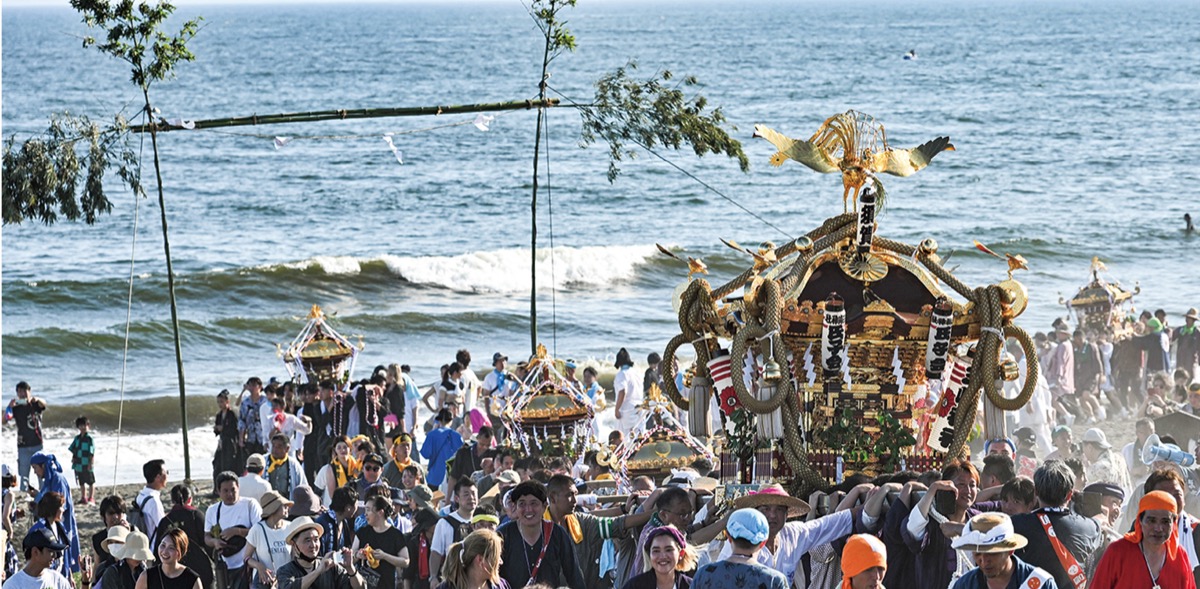 4年ぶりに通常開催となった今回は、全8基の神輿が地域を巡行したほか、平塚海岸では「浜降祭」が行われた=写真。また夜には、子どもたちのパレードのほか、神輿や太鼓屋台が宮入する「お祭りパレード」を実施。参加者は「ようやく須賀の夏が戻ってきた。暑い夏を元気に乗り越えられる」と話していた。