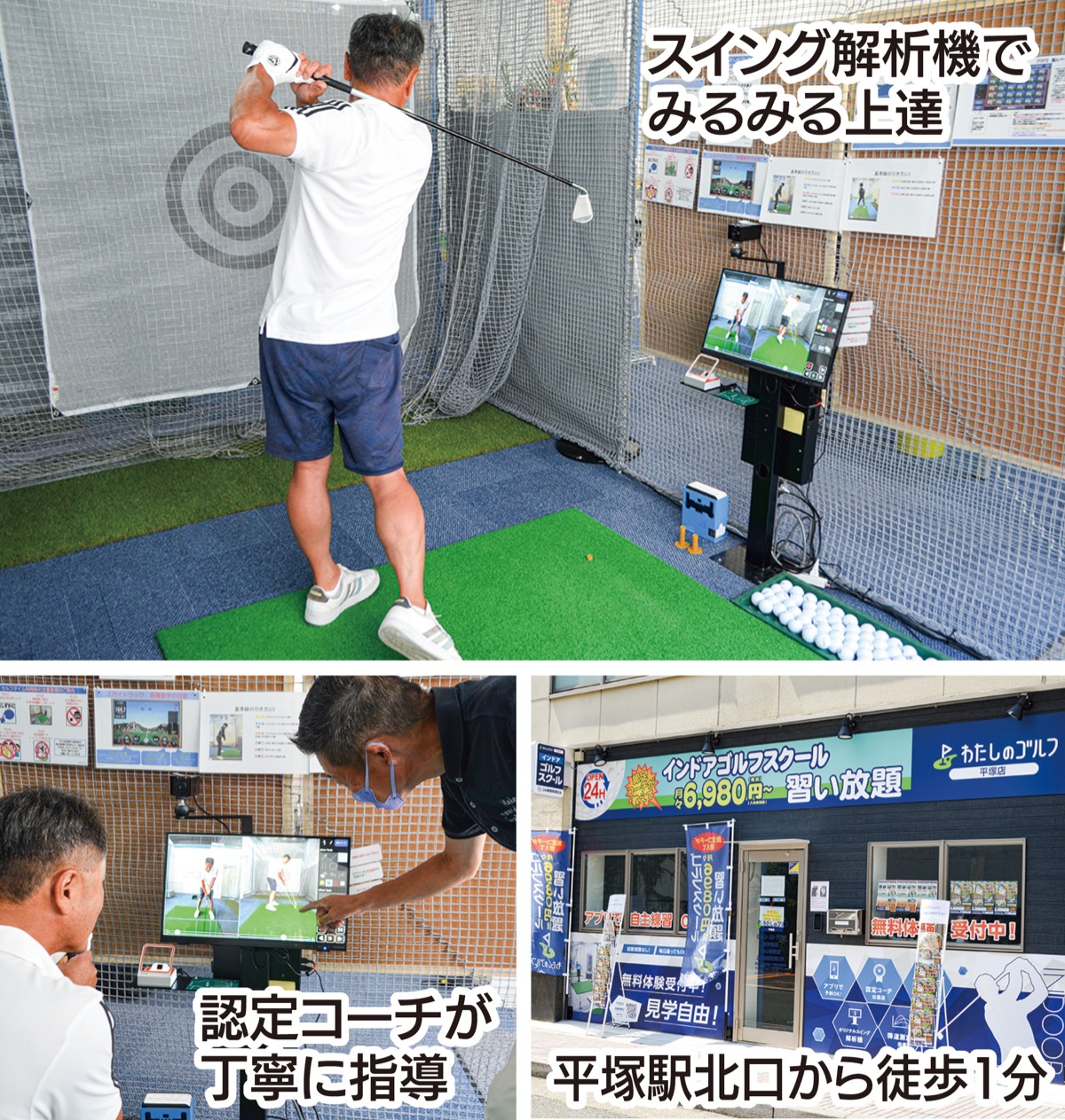 平塚駅北口徒歩1分に24時間営業のインドアゴルフスクール「わたしのゴルフ平塚店」が7月オープンした。無料体験レッスン後、即日入会すると入会金が11000円OFF。さらに当月・翌月会費が無料になるキャンペーンも8月末まで実施している。