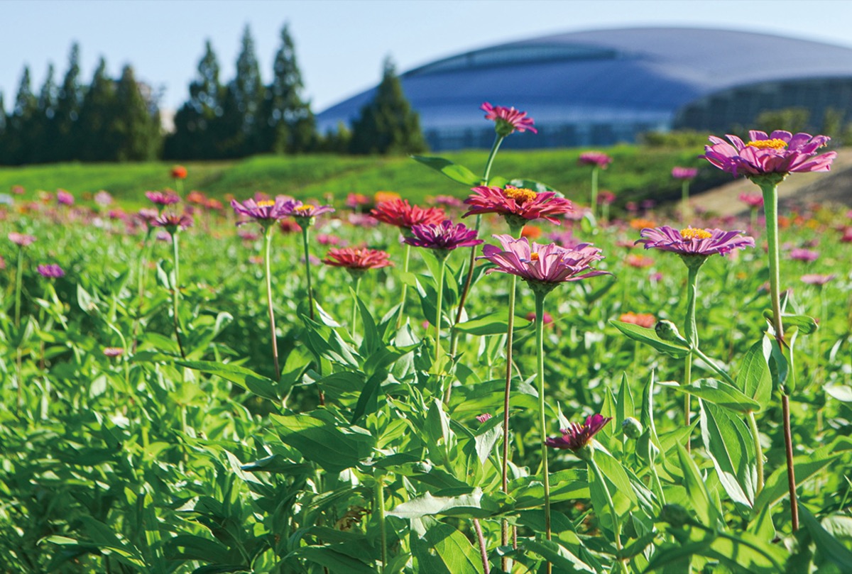 夏から秋にかけて、長い期間花を咲かせることから名づけられた「百日草」。同所では5月下旬に種をまき、7月中旬に開花した。市みどり公園・水辺課によると、8月いっぱいが見ごろという。市とボランティア団体が協力して草取り等の維持管理を行っている。