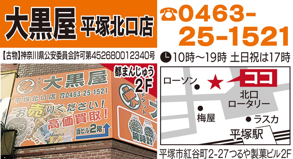 「査定金額に自信あります!」と爽やかな笑顔で話すのは、平塚駅北口徒歩1分、都まんじゅう2階にある「大黒屋」の店長・大野恭兵さん。