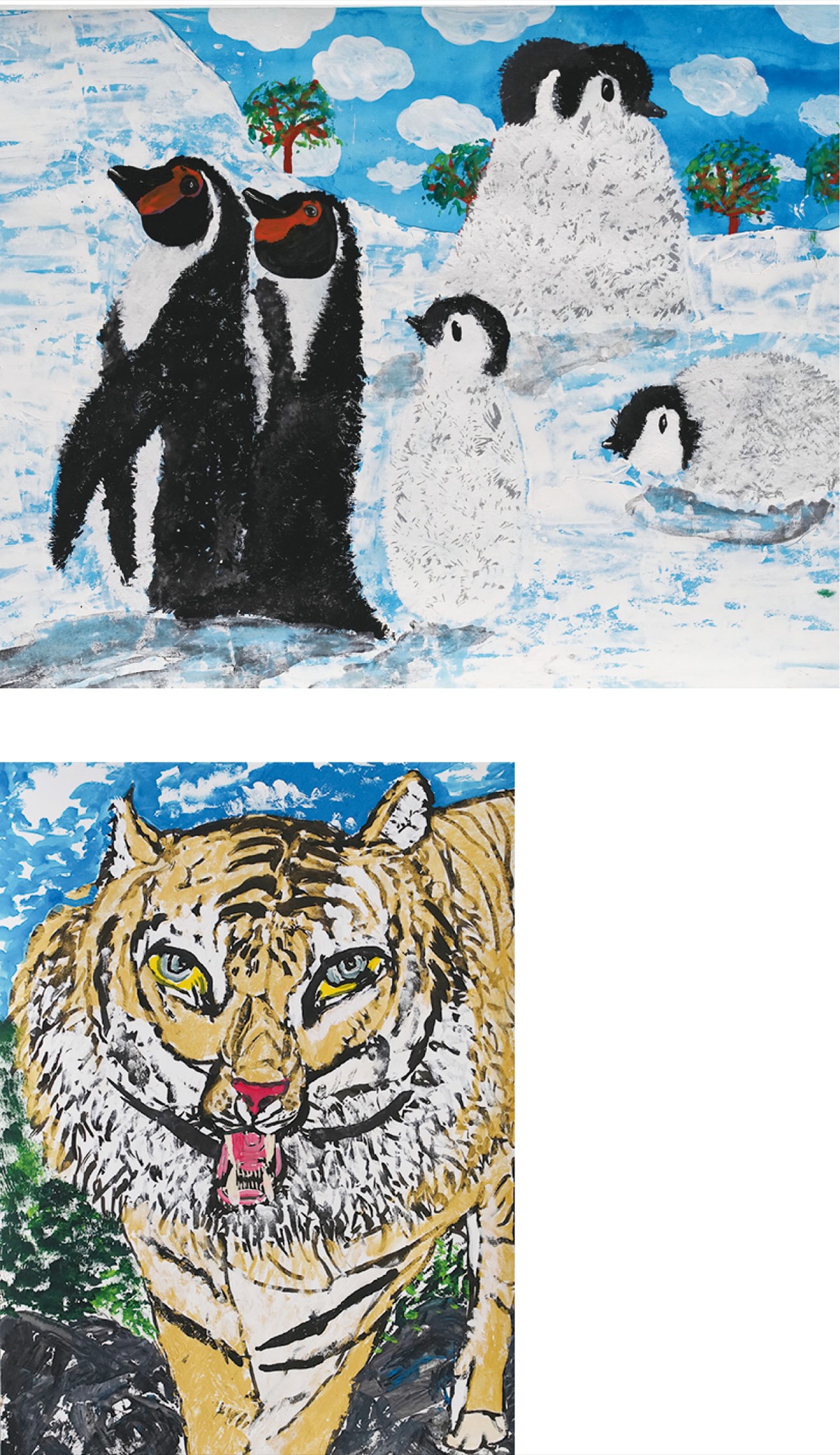 平澤さんは、昨年夏の家族旅行で訪れた旭山動物園で見たトラを被写体に選んだ。輪郭は書道の墨を使って描き、金色の水彩絵の具で鮮やかな毛色を表現した。