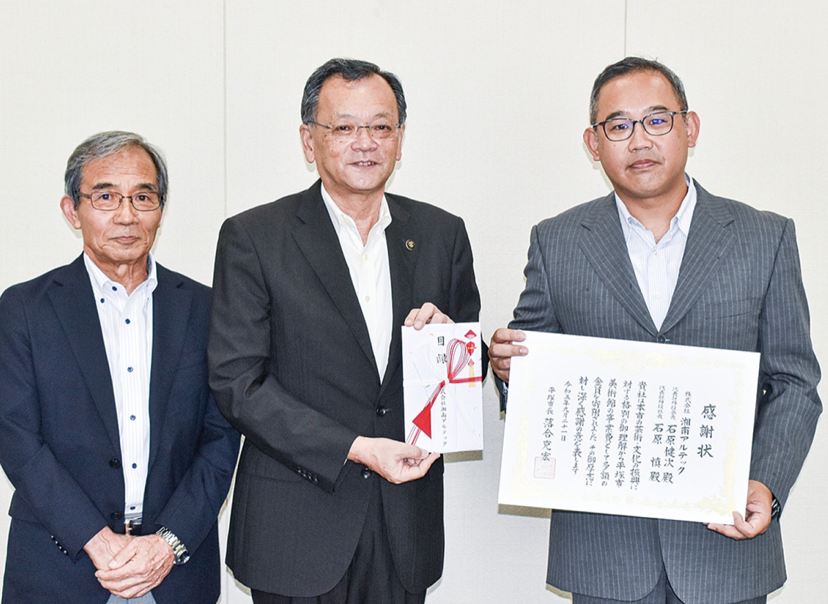 平塚市の美術振興に役立ててもらおうと、製造業の湘南アルテックが市美術館に100万円を寄付した。9月21日に市役所で贈呈式があり、同社の石原健次会長と石原慎社長が落合克宏市長に目録を手渡した。
