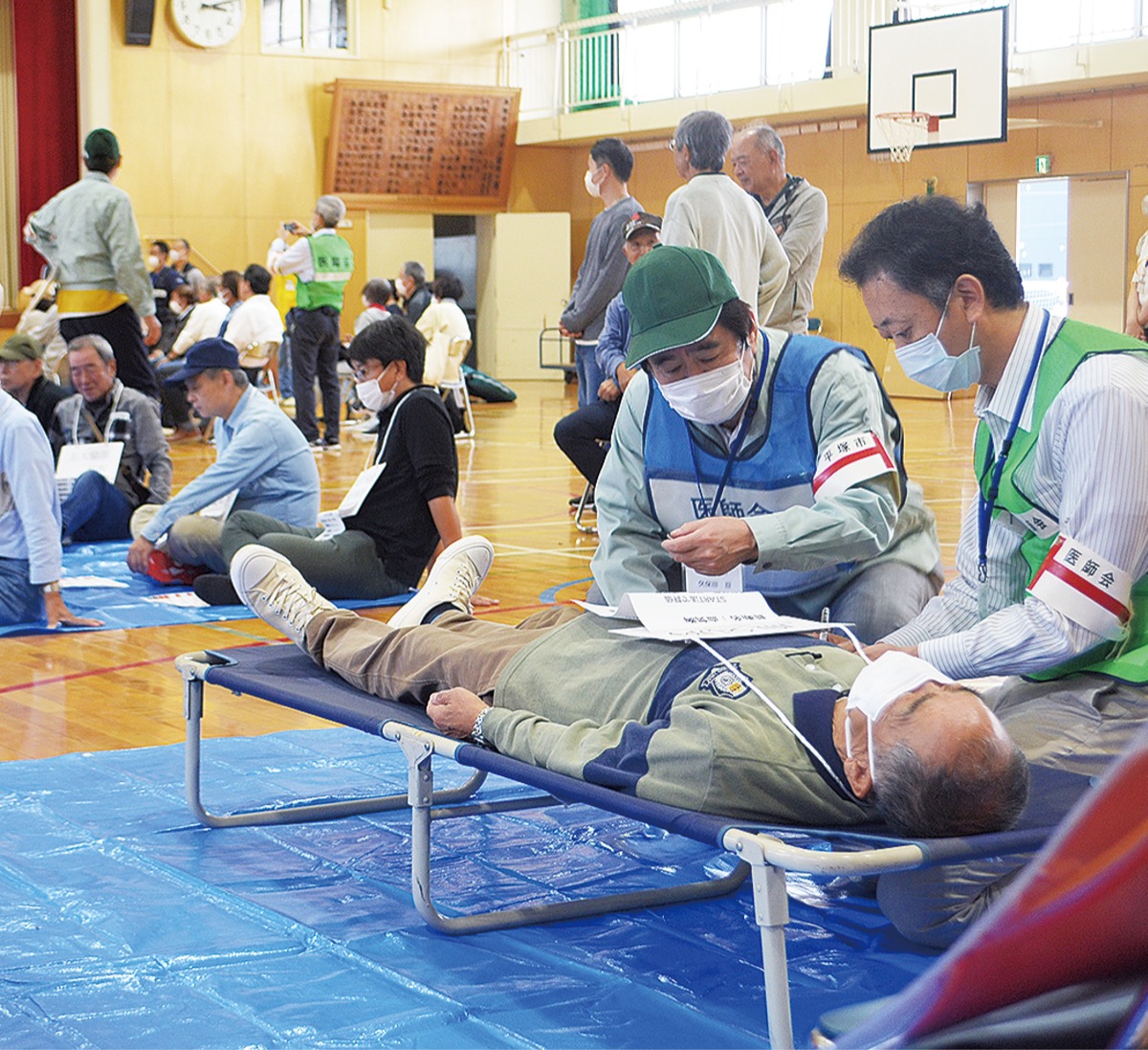 平塚市医師会(久保田亘会長)と金目地区連合自治会(秋山博自治会長)の防災訓練が10月14日に金目小学校体育館で行われ、両会のほか、平塚中郡薬剤師会や市赤十字奉仕団、市職員ら約90人が参加した。