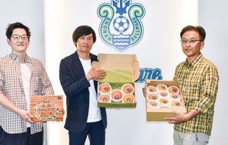 秋の味覚を食べてJ1残留を――。大磯町で大玉柿を生産するフィールドワーク株式会社(市内)が10月17日、湘南ベルマーレに収穫した柿を寄贈した。