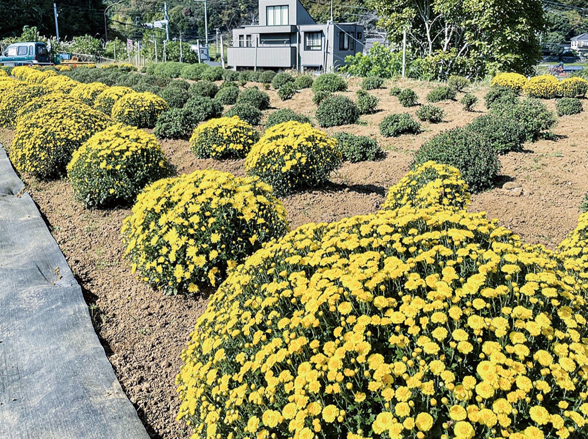 土屋小学校入口交差点付近にある「土屋ざる菊園」のざる菊が見ごろを迎えている。赤、白、黄、ピンク色の約600株が鮮やかに並ぶ。