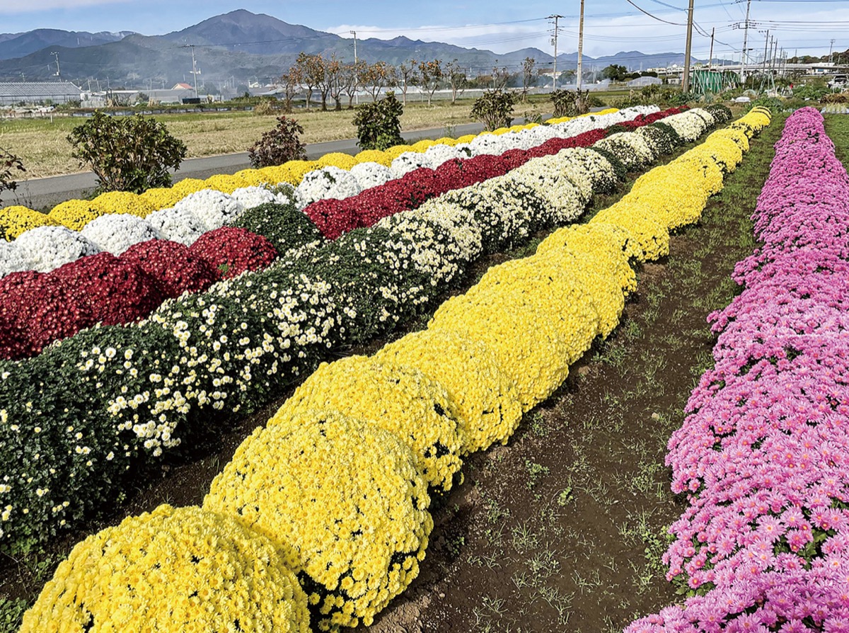 平塚市農の体験・交流館(寺田縄457の5)付近に咲くざる菊が見ごろを迎えている。白、ピンク、黄、赤色など6種類、150株ほどがずらりと並ぶ。