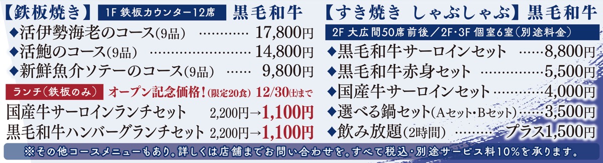 黒毛和牛はもちろん、鉄板料理の王道、活伊勢海老や活鮑、フォアグラなど海の幸と山の幸を贅沢に使ったコース、単品セットやアラカルトも充実。さらに宴会には飲み放題コース(1500円/人数により応相談)も用意している。