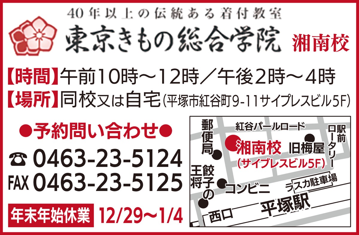 ”キレイに、楽に、楽しく”をモットーに平塚で50年以上続く着付け教室「東京きもの総合学院湘南校」で着付けを学びませんか?12月7日(木)〜1月10日(水)の期間中、「きもの着付無料1回体験」を実施中。