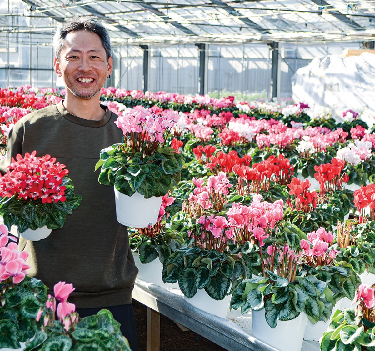 同園のシクラメンは、昨年11月に種をまき、1年1カ月ほどかけて栽培。今年は猛暑の影響で根の生育が悪く、水や肥料の管理に苦労した。雅幸さんは「暑さで花の開花が例年よりも遅かったが、肥料を通常より減らし根のダメージを和らげるよう調整したので、例年通りの出来栄え」と自信をのぞかせる。
