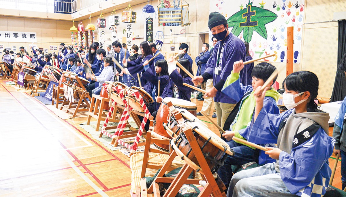 各地区に分かれて児童が祝賀太鼓も演奏。力強い太鼓の音色が会場全体に響き渡った。校歌斉唱や同校のあゆみがまとめられたスライドショー、卒業生からのお祝いメッセージの上映なども行われ、最後は出席者の笑顔あふれる記念撮影で式典が締めくくられた。