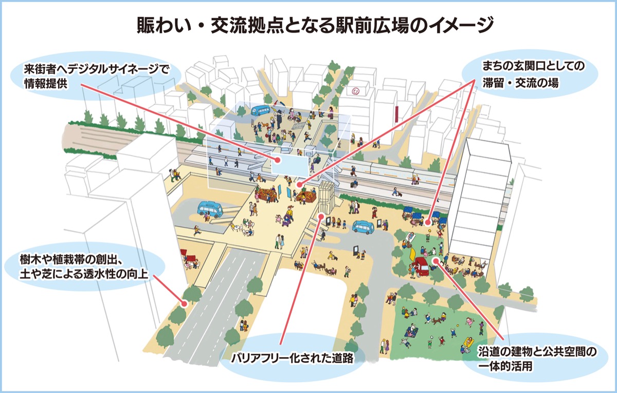 また、それらの方向性を踏まえて、駅前広場や道路、公園・広場、市街地の将来像をそれぞれイメージとして示した。