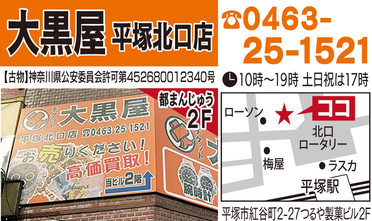 平塚駅北口徒歩1分、都まんじゅう2階にある買取・販売店「大黒屋」では、各種ブランドバッグや時計、ジュエリーなどの買取を強化中だ。