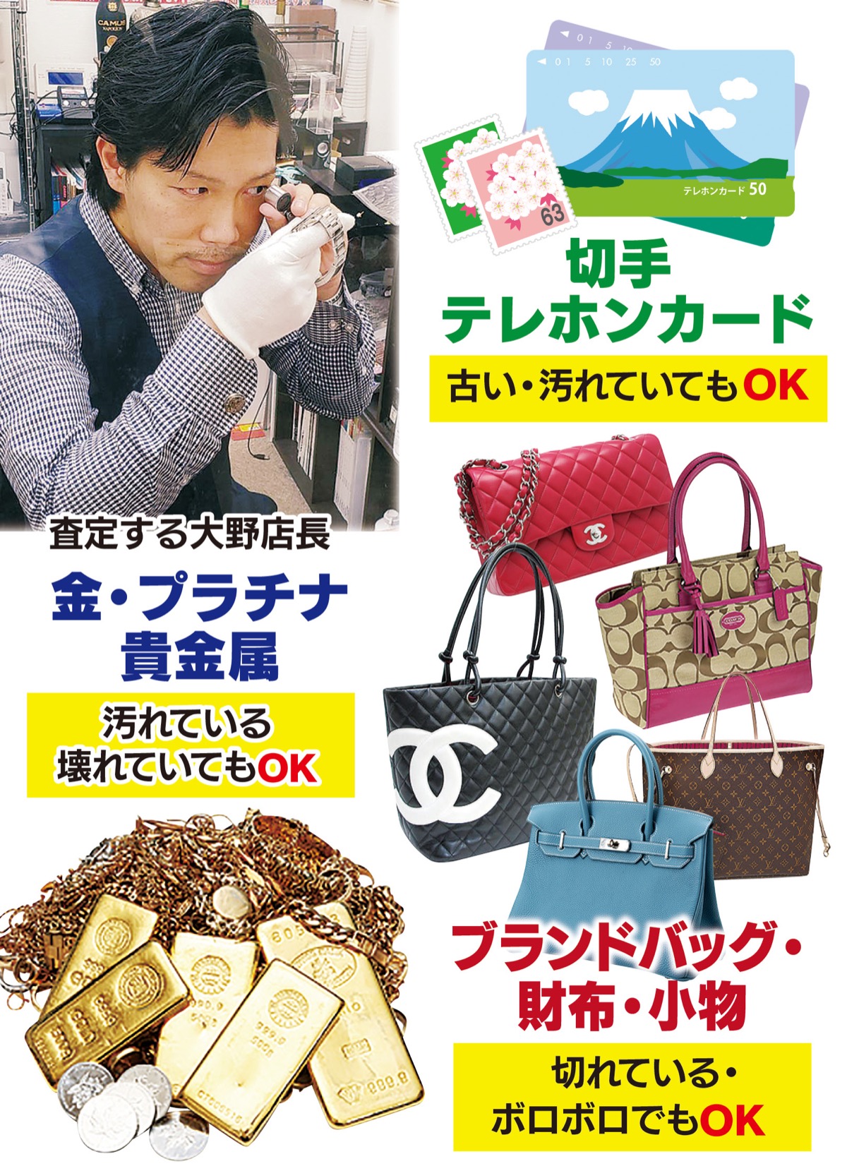 査定士歴15年以上のベテラン・大野恭兵店長は、「当店では、根拠のない査定アップや違法な営業活動をすることはありません。誠意ある接客を心がけます」と話す。買取品目は、貴金属やブランドバッグの他、切手や商品券、時計など多岐に渡る。まずは無料査定に行ってみよう。
